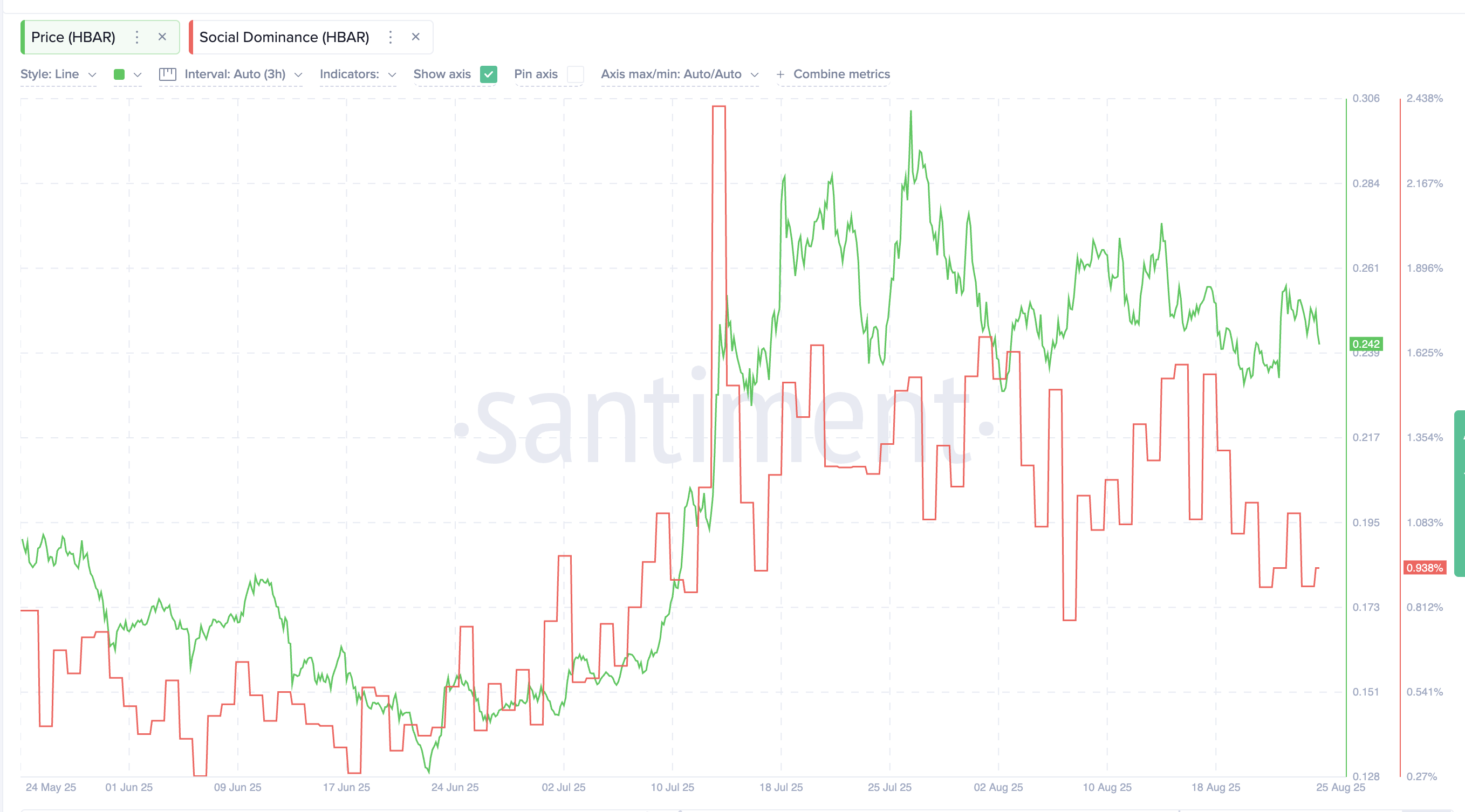 需要注意的是,当前看涨结构已如履薄冰,任何突破都可能改变局面。一个警示信号来自HBAR市场关注度的持续下滑——自7月中旬以来,其社交主导地位下降近90%,从7月13日2.41%的高点降至目前的0.93%,反映出讨论热度的急剧降温。