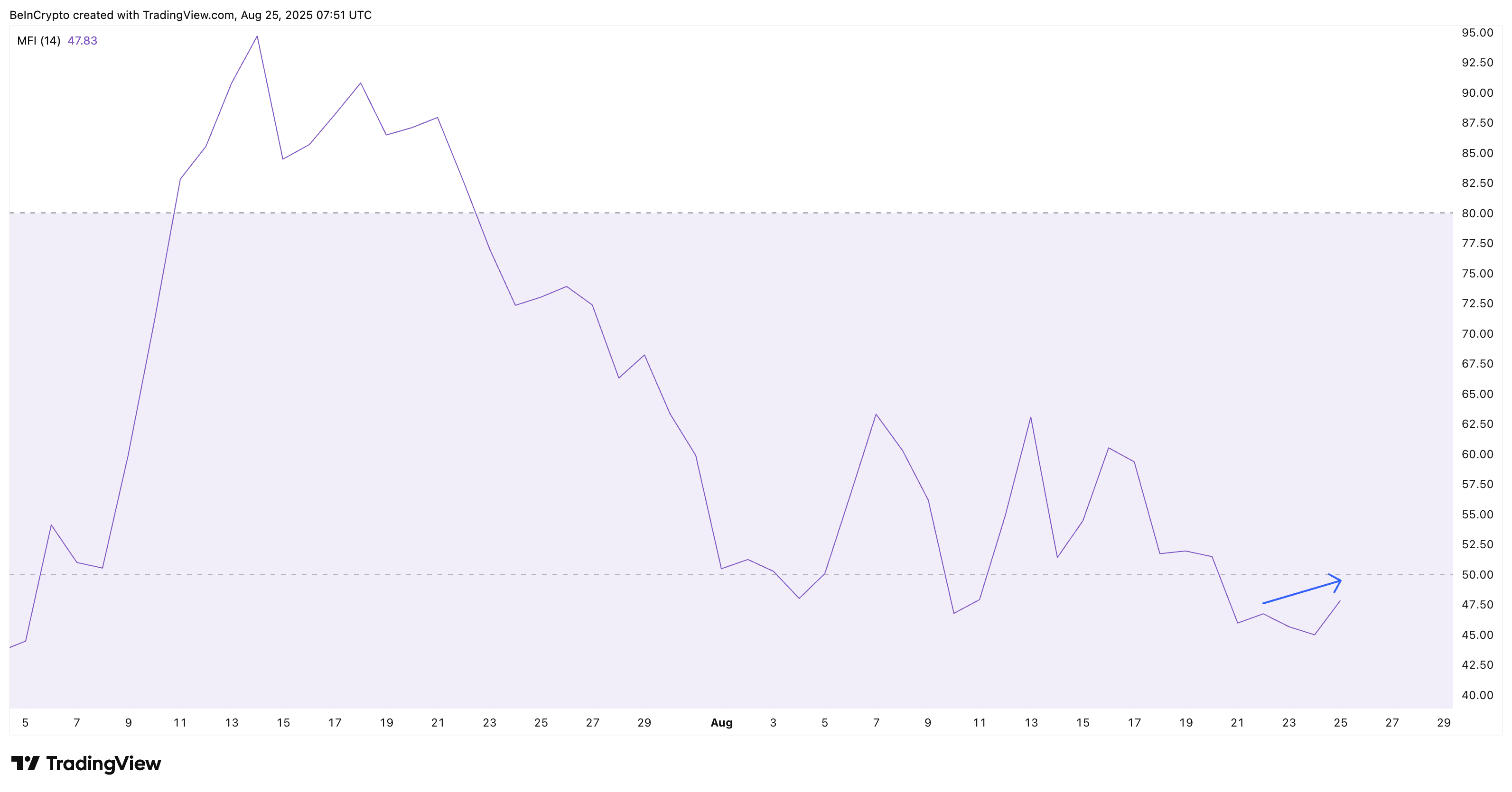 目前买方力量仍在发挥作用:衡量资金流向的货币流量指数(MFI)在价格下跌时从45升至47.8,表明逢低买盘正在介入。这验证了短期结构仍保持看涨,但已十分脆弱。