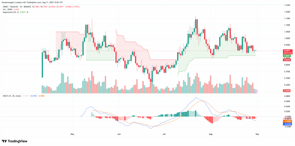 除形态结构外,技术指标显示ONDO动能持续疲软。当前代币价格接近0.87美元的超级趋势支撑,为买家提供短期防线。若失守,可能进一步下探0.83-0.80美元区间。