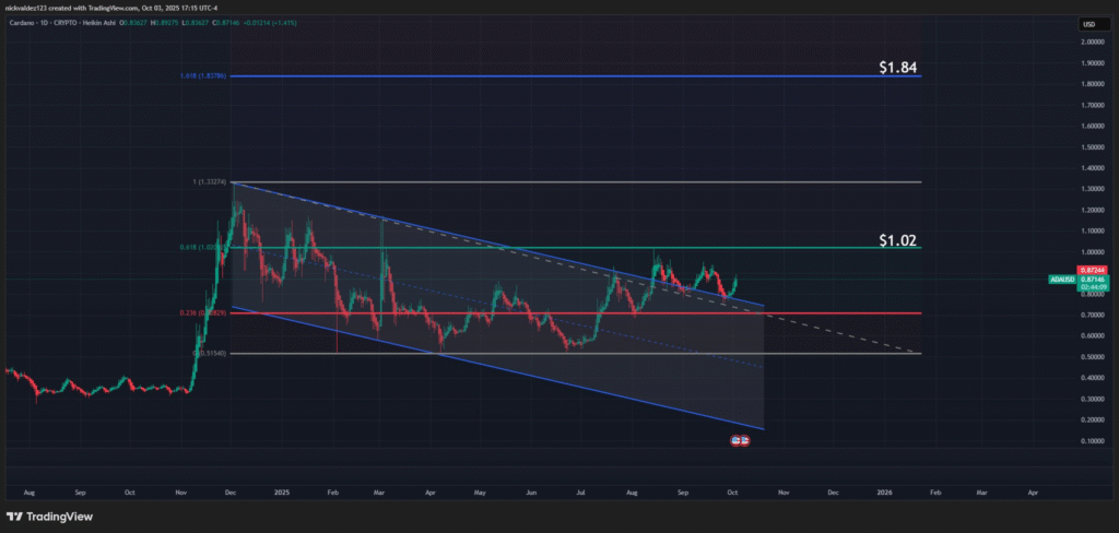 若能突破1.02美元,ADA可能将1.84美元作为下一目标阻力位。斐波那契回撤水平进一步印证1.02美元价位在未来数月的关键作用。