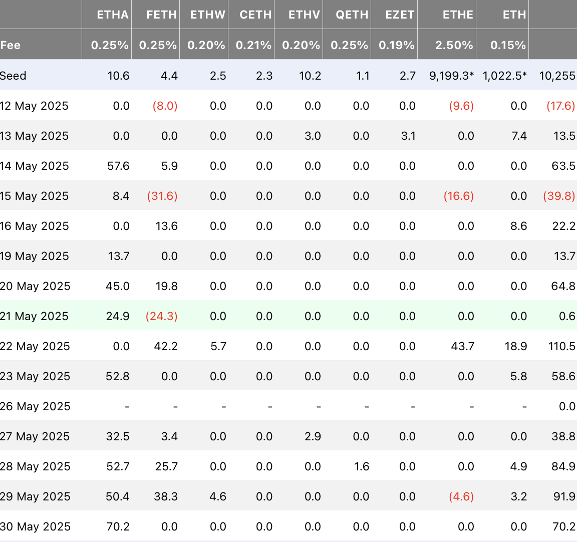 值得注意的是,这些资金全部流入贝莱德旗下的ETHA产品,而其他ETF均未录得任何资金流动——既无流入也无流出。