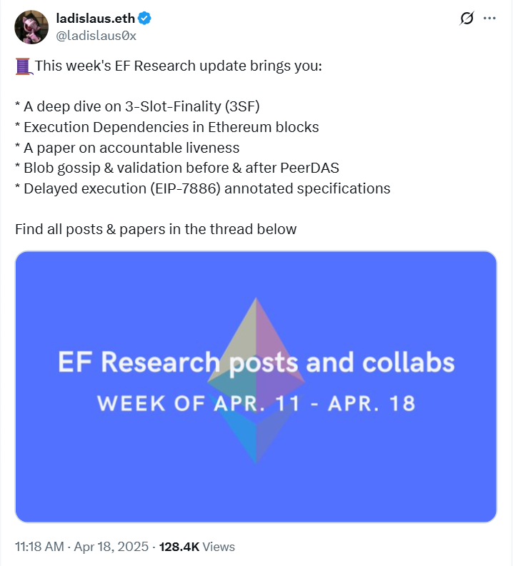 在最近的网络更新中,一位以太坊(ETH)核心开发者重点介绍了区块链正在推进的五个关键项目。4月11日和18日发布的新创新表明,该团队在保持去中心化结构的同时,继续致力于加强网络建设。与此同时,Pectra升级的准备工作仍在按计划进行,没有出现延迟迹象。