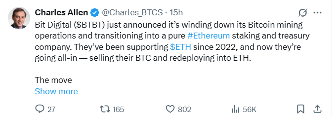 纳斯达克上市的数字化资产公司Bit Digital通过其高管Charles Allen在社交平台X上宣布,正式结束比特币挖矿业务。这一经过数月酝酿的决定,为该公司开辟了新的发展路径。值得注意的是,Bit Digital自2022年起就已布局以太坊质押业务,而此次公告意味着其已全面押注该领域。