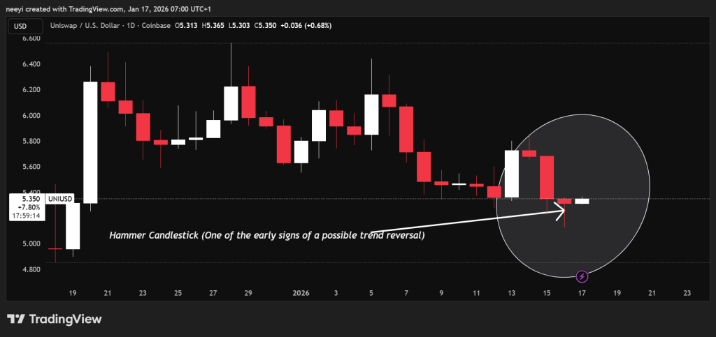 UNI价格自十二月中旬以来持续承压,反映了多个以太坊系资产普遍经历的冷却阶段。尽管处于下行趋势,近期日线图却呈现锤形蜡烛形态,这种结构常与潜在趋势暂停或反转相关联。