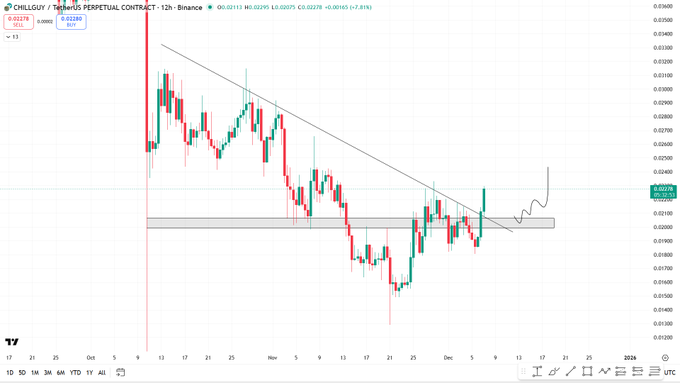CHILLGUY本周确认突破了自11月初以来压制每次反弹的下降趋势线。最近一根12小时K线坚定收于该边界之上,表明卖方已失去对结构的控制。截至撰稿时,CHILLGUY报价0.02049美元,24小时涨幅3.45%,尽管周末成交量仍然偏低。