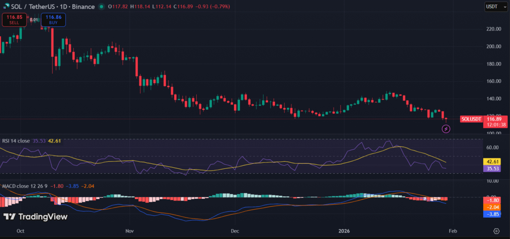 尽管交易量活跃,但受整体加密市场疲软的影响,Solana (SOL) 目前交易在116.84美元附近。技术指标显示SOL仍处于下降趋势中,支撑位在112-115美元区间,阻力位则在123-130美元附近。