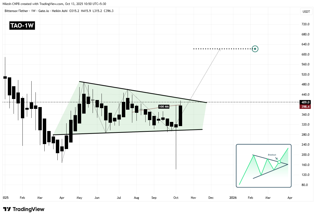 当前TAO交易价约409美元,已成功收复398.4美元的100周移动平均线(MA)——这个关键的技术里程碑通常预示买盘兴趣重燃。该代币目前徘徊在上方阻力趋势线下方,表明突破压力正在积聚。