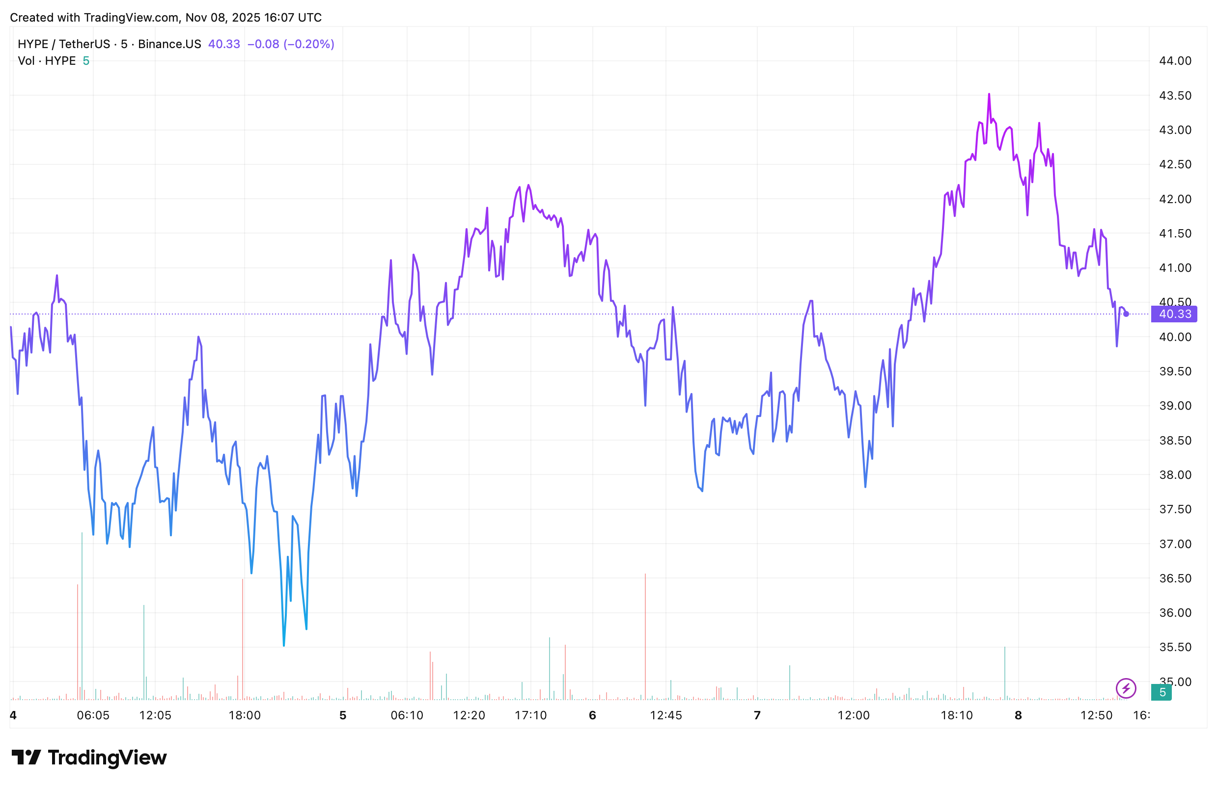 本周早前强劲上涨将Hyperliquid (HYPE)推升至近43美元后,目前显现疲态。截至11月8日,HYPE交易价格约为40.1美元,过去24小时下滑1.26%。此前48小时内价格曾波动性冲高至42.9美元后失去动力。