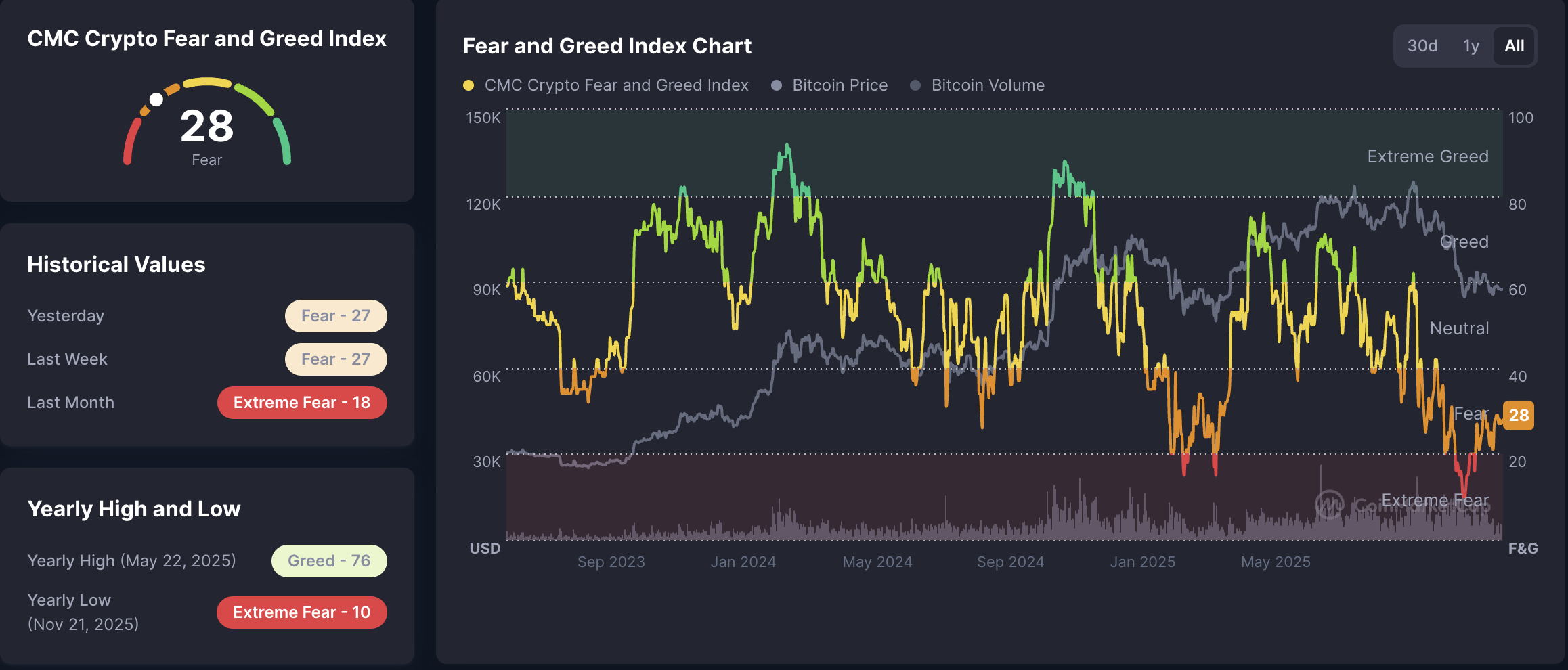 自十月崩盘以来,市场情绪始终在"恐惧"与"极度恐惧"间徘徊,截至发稿时该指数为28分。虽然恐惧与贪婪指标仍显示投资者心存恐惧,但较过去几个月的主流市场情绪已略有改善。
