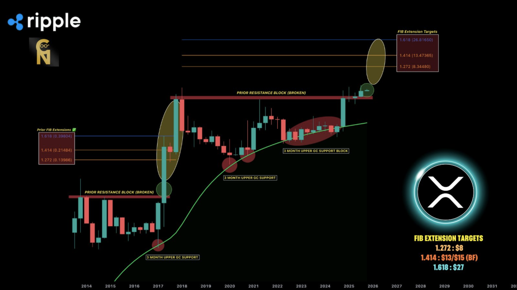 加密货币市场对XRP的未来前景愈发乐观,分析师预测其价格将在明年迎来显著上涨。基于当前市场趋势的技术分析,XRP可能攀升至27美元高位。该资产有望维持在2美元上方(即2018年1月蜡烛收盘高点),并可能触及8至27美元的斐波那契扩展目标位。