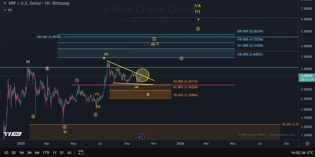 Morecryptoonl根据近期市场动态对XRP前景作出研判。分析师认为,7月的回调仅是更大看涨周期中的短暂停顿。若XRP能守住2.65美元支撑位,或将很快突破3.40美元。下降楔形形态可能引发强劲上涨,为XRP突破此前5美元的历史高点创造条件。