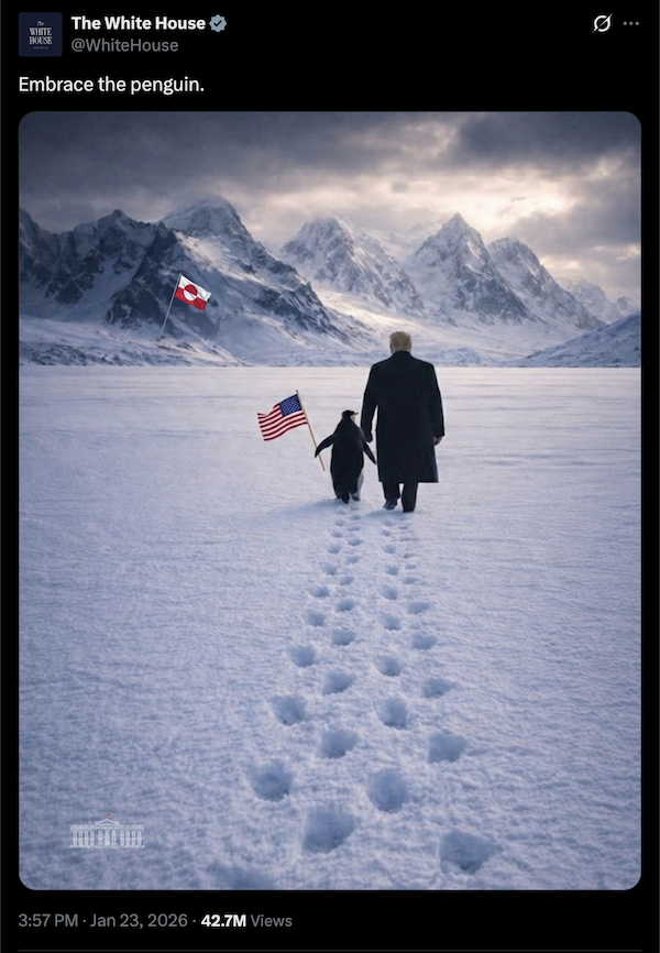 上周五,白宫在X平台发布美国总统与企鹅携手雪中漫步的帖文并迅速传播。数据显示,该帖发布前PENGUIN市值约38.7万美元,帖文发布后24小时内交易量达2.44亿美元。