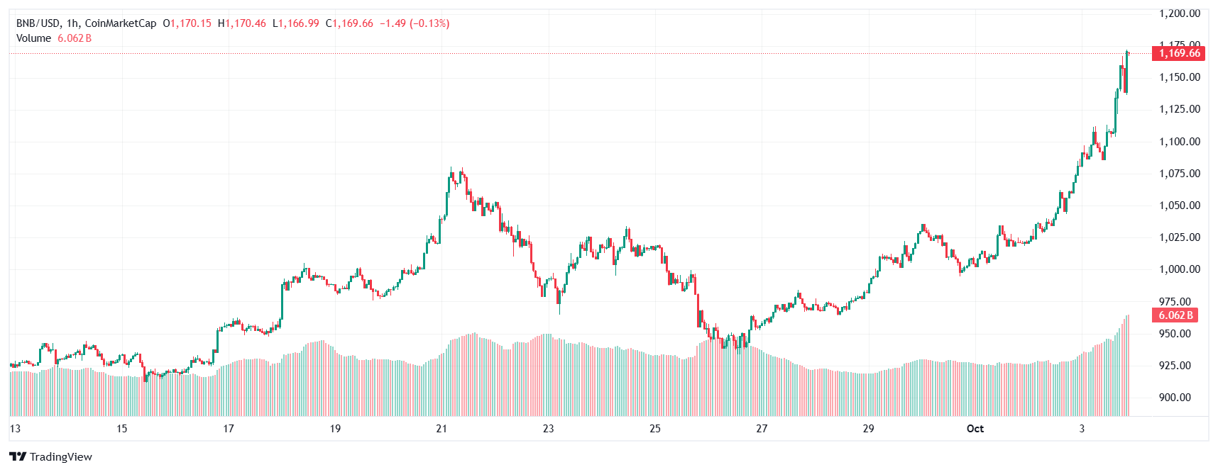 BNB走势图显示强劲的上升趋势。在960美元附近盘整后,该代币突破阻力位飙升至1100美元上方。单日交易量突破60亿美元,表明这不仅是技术性突破,更是资金强势介入的结果。