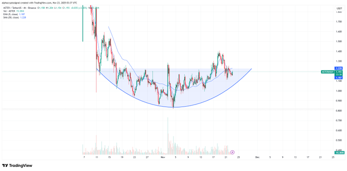 随着市场对交易量下降和近期价格回调作出反应,ASTER持续呈现整理态势。在4小时图表中,该代币仍保持在圆弧底形态的上升曲线上方,维持着积极的技术结构。