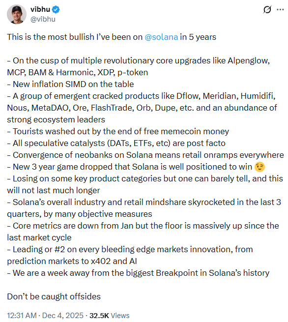 虽然网络在个别领域有所落后,但这些差距微乎其微且可能很快弥合。核心指标虽较一月峰值有所回落,但整体基础仍优于上一周期。在预测工具、x402 及 AI 相关项目等前沿领域,Solana 始终保持领先或第二的市场地位。生态系统正在筹备年度最重要的 Breakpoint 大会,预计将引发广泛关注。