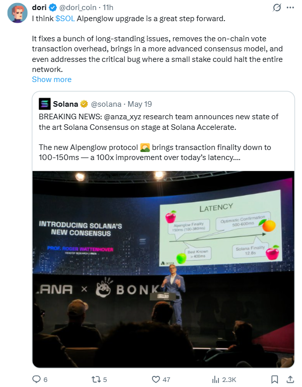 Alpenglow 升级已成为当前讨论的焦点。开发者视其为解决若干历史遗留问题的重要方案。该升级将减少链上投票活动、优化共识步骤,并修复了少量权益质押即可导致网络停滞的漏洞。