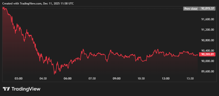 尽管美联储降息符合市场预期且政策制定者释放更乐观的宏观展望,比特币仍在周四交易时段延续跌势,跌破90,000美元关口。这一走势凸显出加密货币与更广泛风险资产反弹之间的脱钩正在加深,结构性抛售和年末流动性稀薄持续对价格构成压力。