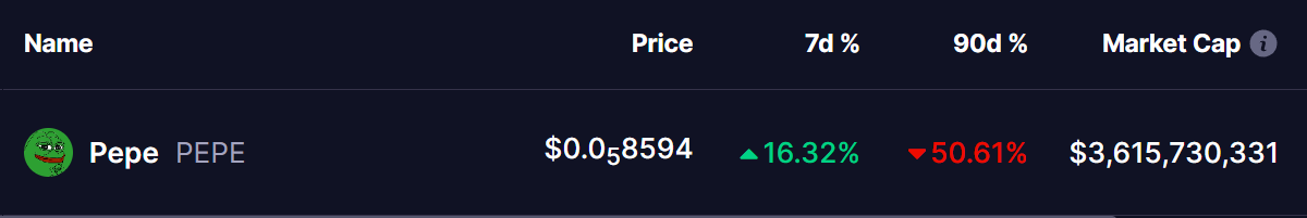 在众多表现突出的币种中,Pepe(PEPE)尤为引人注目。在过去90天经历大幅下跌后,该币种在过去一周内上涨超过16%,实现了关键的技术突破。此外,鲸鱼资金的积累显示出市场对该代币价格潜力的信心增强,暗示着进一步上涨的可能性。
