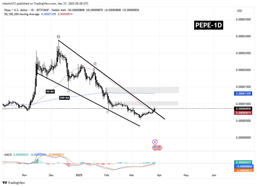 日线图显示,PEPE从下降楔形形态中实现了看涨突破,这是一个历史上强劲的反转信号。PEPE成功突破0.0000079美元,超过了上方阻力趋势线和50日移动平均线(MA)。在此突破后,PEPE飙升至0.00000856美元,显示出强劲的看涨势头。
