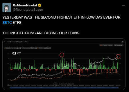 史上第二大比特币ETF单日资金流入——机构正在加仓 | 来源:Mario Nawfal, X