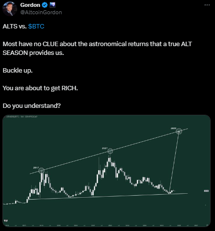 山寨币vs比特币,真正的山寨季=改变人生的收益 | 来源:Gordon, X