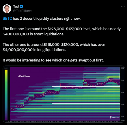多周期图表显示价格走势保持建设性。比特币在9月涨势形成的上升通道内行进,回调时持续创出更高低点。分析师将125,000-127,000美元划为近期阻力区,有效突破该区域可能打开130,000美元乃至135,000美元的上涨空间。下行方面,115,000-120,000美元区间汇集了通道中轨支撑与近期需求簇,此前曾获买家捍卫。