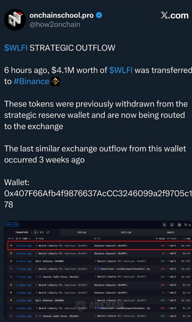 在执照申请推进的同时,链上数据显示了与WLFI治理代币相关的活动。与WLFI战略储备金相关的钱包向币安转移了价值约410万美元的代币。此前也曾出现类似转移,表明这是一种重复模式而非单一事件。