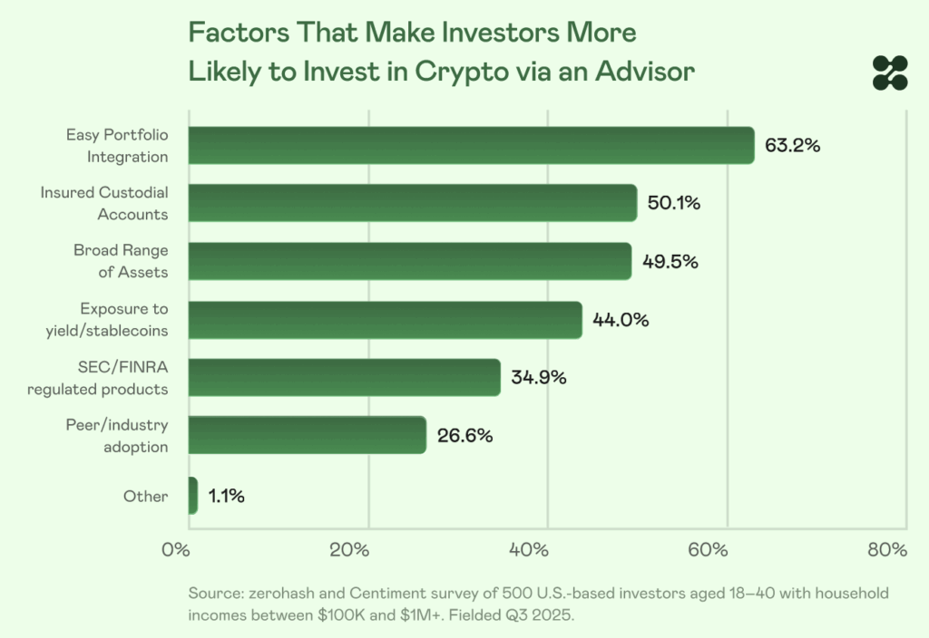 调查显示投资者对顾问服务提出新要求。投资组合整合成为通过顾问投资加密货币的首要考虑因素,安全特性位居第二。半数受访者表示投保托管账户将增强他们使用顾问服务的意愿。