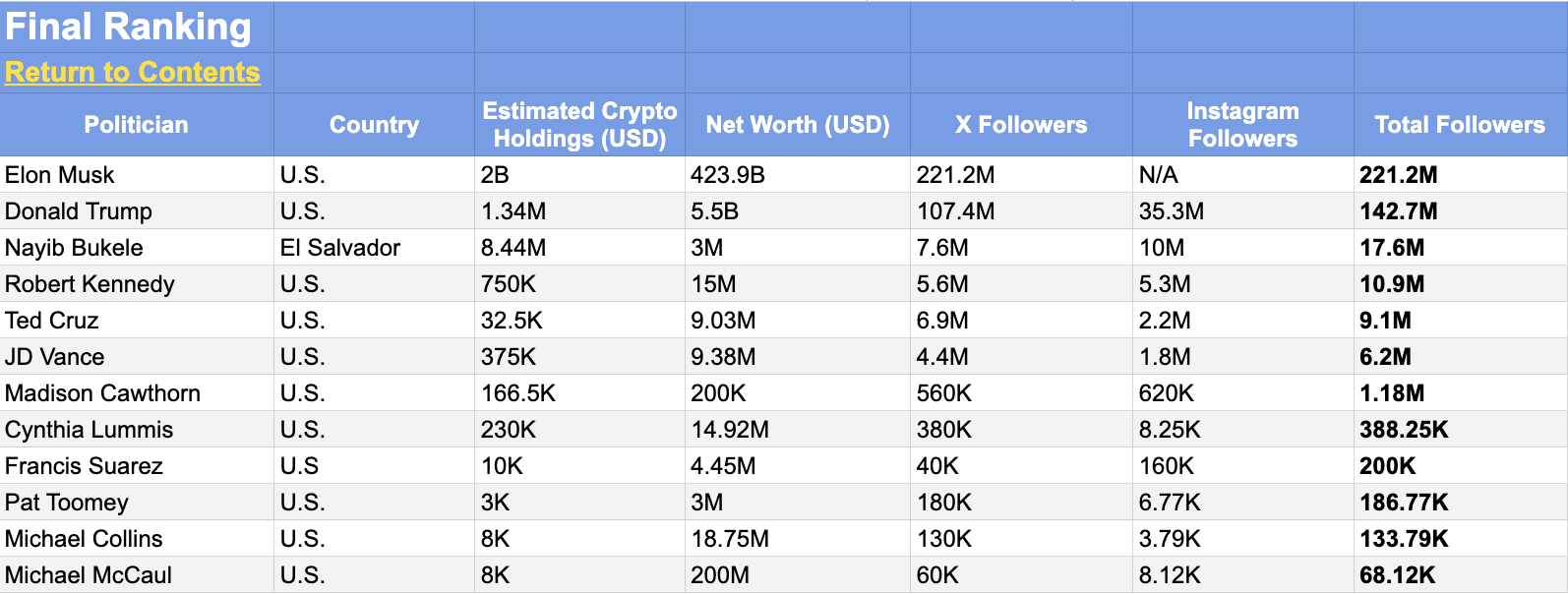 最终得分基于X平台和Instagram的总粉丝量,反映公众人物塑造舆论及吸引加密领域关注的能力。