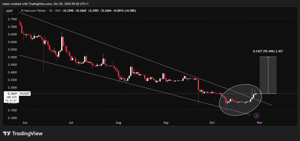 派币在经历数月下跌通道后终于迎来转机,四日内涨幅超30%,现报约0.25美元。技术图表显示,价格有效突破下降通道上轨,这通常被视为趋势反转的重要信号。