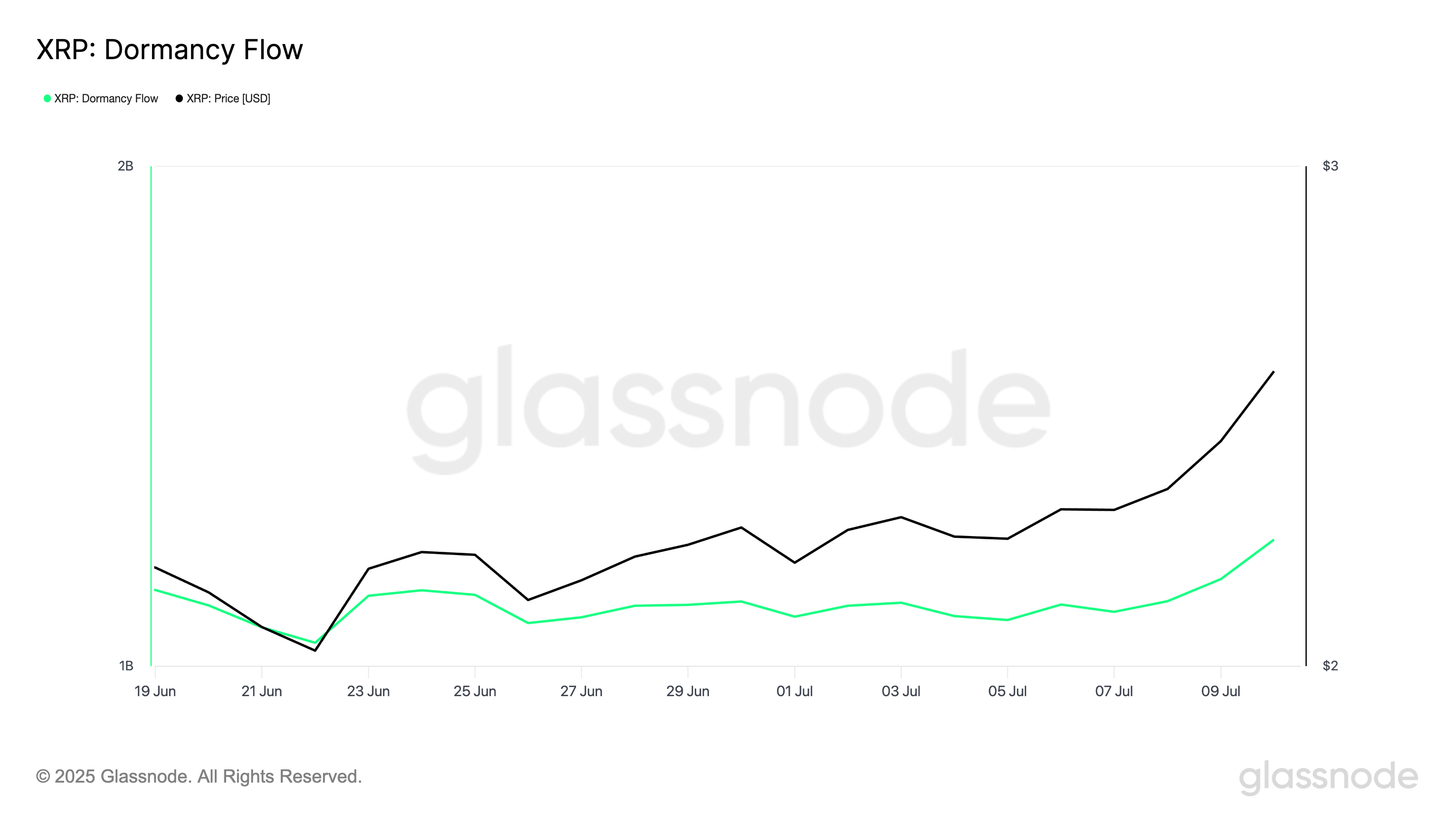 自6月22日日内交易时段跌至周期低点1.90美元后,XRP价格持续走高。截至发稿时,该代币已上涨近30%,交易价格达2.58美元。值得注意的是,伴随这轮上涨,XRP的休眠流指标(Dormancy Flow)持续攀升。链上数据显示,该指标在6月22日触及年内低点,但目前数值已达11.9亿XRP。