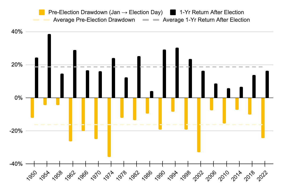 币安研究公布的数据显示,比特币在中期选举年份经历了显著下跌,包括2018年下跌73%和2022年下跌64%。然而,在投票后的12个月内总是伴随着强劲反弹。