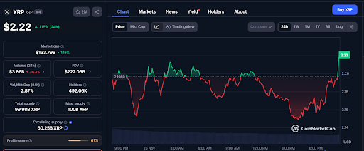 XRP价格在24小时内上涨1.15%,达到2.22美元