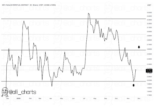 当前XRP价格趋势暗示长期格局可能改变,市场分析师预计新趋势即将形成。根据Ali Charts的观察,XRP价格近期从通道底部反弹,显示出上行迹象。该代币曾在通道下轨触及1.90美元低点。