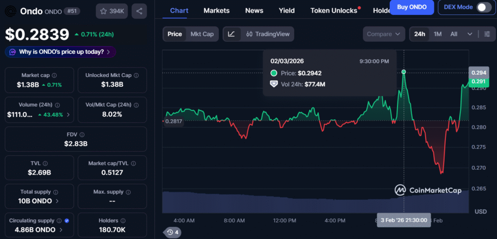 在月度图表显示ONDO下跌35%的背景下,整合消息推动该代币昨日短暂冲高至0.294美元附近,早盘时段回落至0.26美元区间。目前代币已反弹至0.289美元左右交易,过去24小时微涨0.71%,市场参与者持续评估MetaMask整合带来的影响。