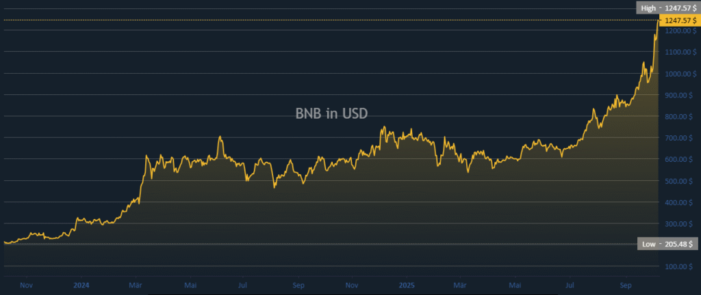 只要维持在1,200美元支撑区间上方,该资产具备进一步上探潜力。价格走势也暗示市场对币安生态系统的信心增强及机构参与度提升。总体而言,BNB仍处于持续增长通道,可能在未来数个交易周期创下历史新高。