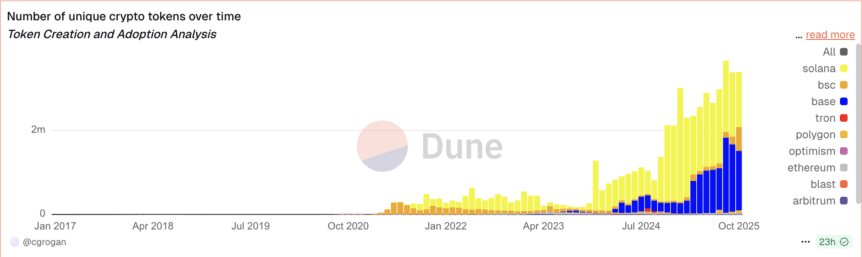 截至2025年初,CoinMarketCap收录的加密货币数量已突破2600万种,较年初增长逾一倍。这种泛滥促使经济学家兼交易员亚历克斯·克鲁格等专家警告称,过度饱和可能会阻碍市场的持续反弹。