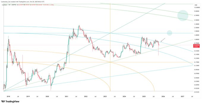 分析师Cantonese Cat(@cantonmeow)分享的周线图表显示,ADA价格正处于江恩方形与江恩弧线构成的分析体系中。该技术框架通过价格与时间的几何关系,直观呈现资产强度与衰竭的周期性规律。自2018年以来,ADA的价格行为持续呼应着这种几何谐波。