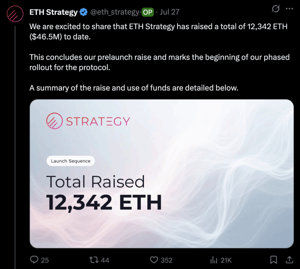 ETH Strategy完成12,342枚ETH(约4650万美元)募资,用于启动国库协议。