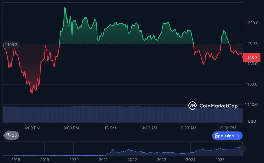 BNB最新交易价格为1,189.50美元,过去1小时微跌0.24%,24小时价格基本持平。尽管短期趋稳,但该代币过去7日累计下跌9.85%,显示市场仍存在看跌压力。