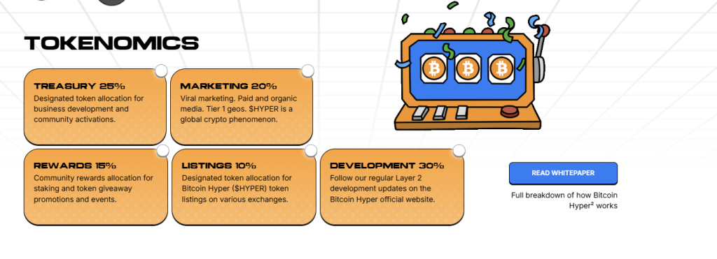 HYPER代币经济学设计均衡:30%分配至开发基金确保二层基础设施与技术路线图可持续推进;25%划入国库用于业务拓展与社区激励;20%投入市场营销;15%用于质押奖励与社区空投;剩余10%预留作上所储备。