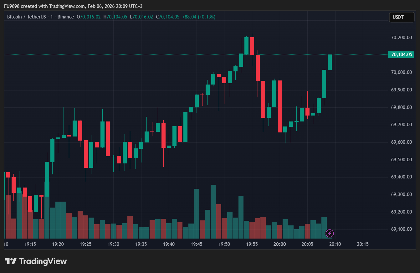 在昨日从略高于六万美元水平回落之后,比特币于周五录得强劲反弹,并再次测试七万美元门槛。目前这一市场领先的加密资产交易价格约为70,165美元,日内涨幅约10%。