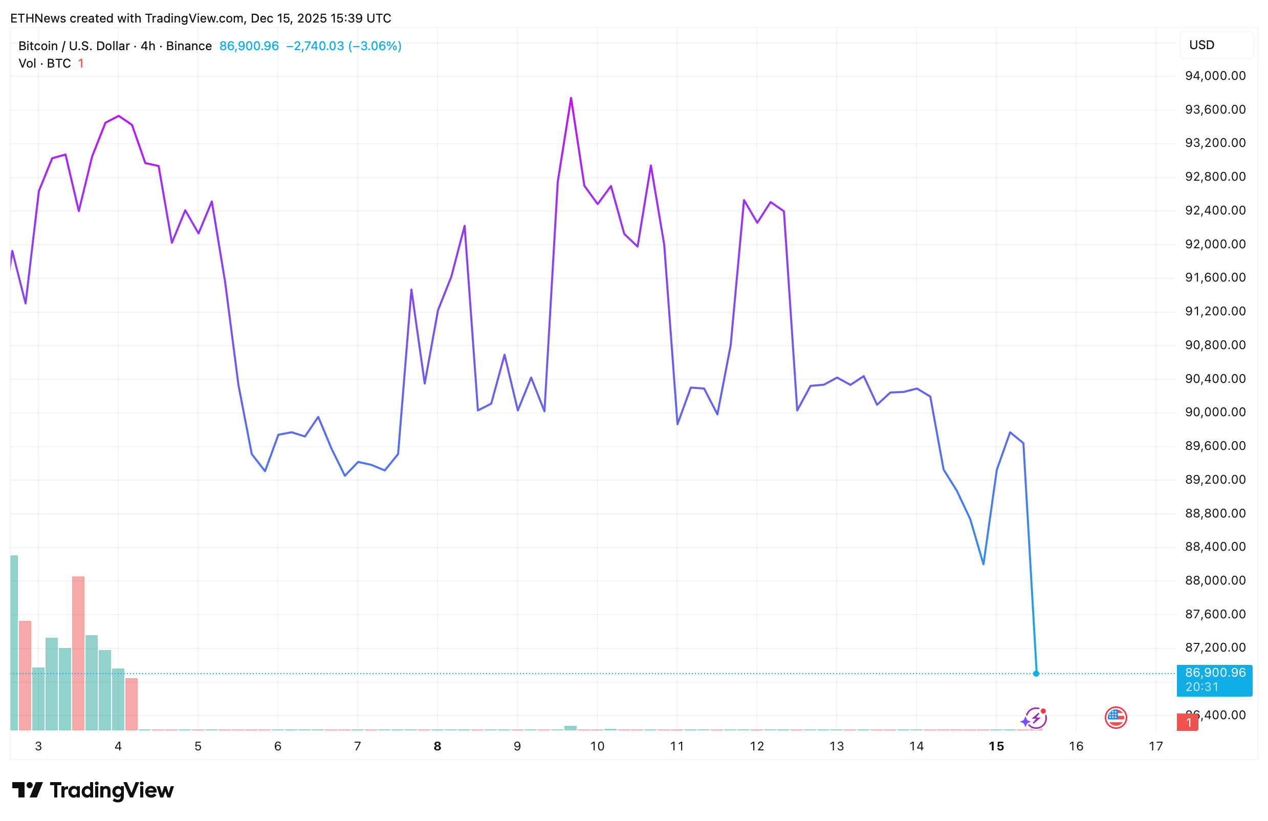 2025年12月15日,比特币再度跌破87000美元关口,随着最新交易时段抛压加剧,短期看跌趋势得到延续。根据TradingView的BTC/USD四小时图显示,比特币日内下跌约3%,跌至86900美元附近。此举抹去了本月早前数次短暂反弹的涨幅,并使价格回落至近期波动区间的下轨。