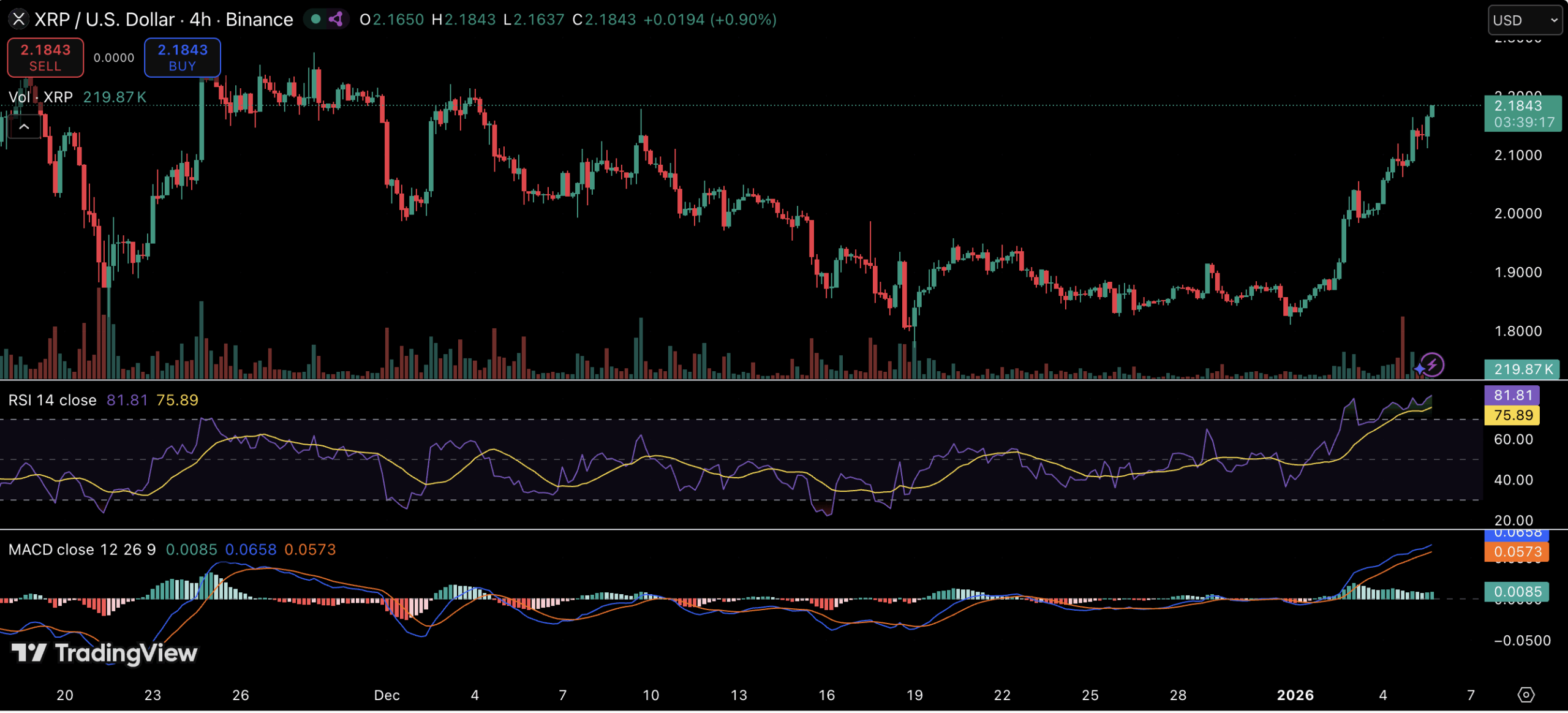 尽管高时间框架聚焦于结构,但4小时图上的动量指标已显示出强劲信号。RSI已推升至70以上的高位区域,反映出强烈的买压,并明确脱离了近期盘整所主导的中性区间。与此同时,MACD保持稳固的正值,柱状图不断拓宽,信号线之间呈现看涨分离。这一组合表明动量不仅积极,而且正在加速,即便短期内可能因超买状况出现回调。