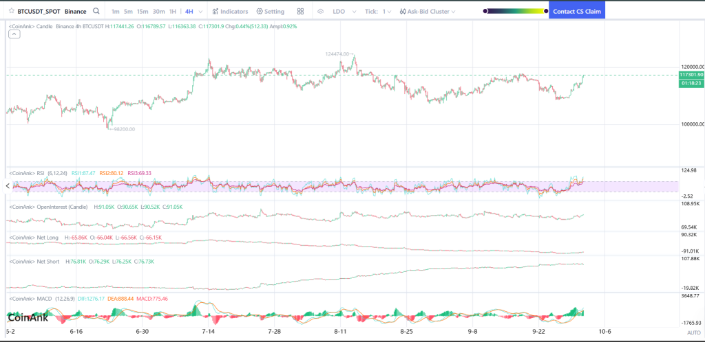 4小时图显示,BTC正从9月末110,000美元低点回升,目前测试118,000美元阻力位。9月19日高点124,474美元仍是关键突破目标,若有效突破该区域,或将快速上探128,000-130,000美元密集阻力区。