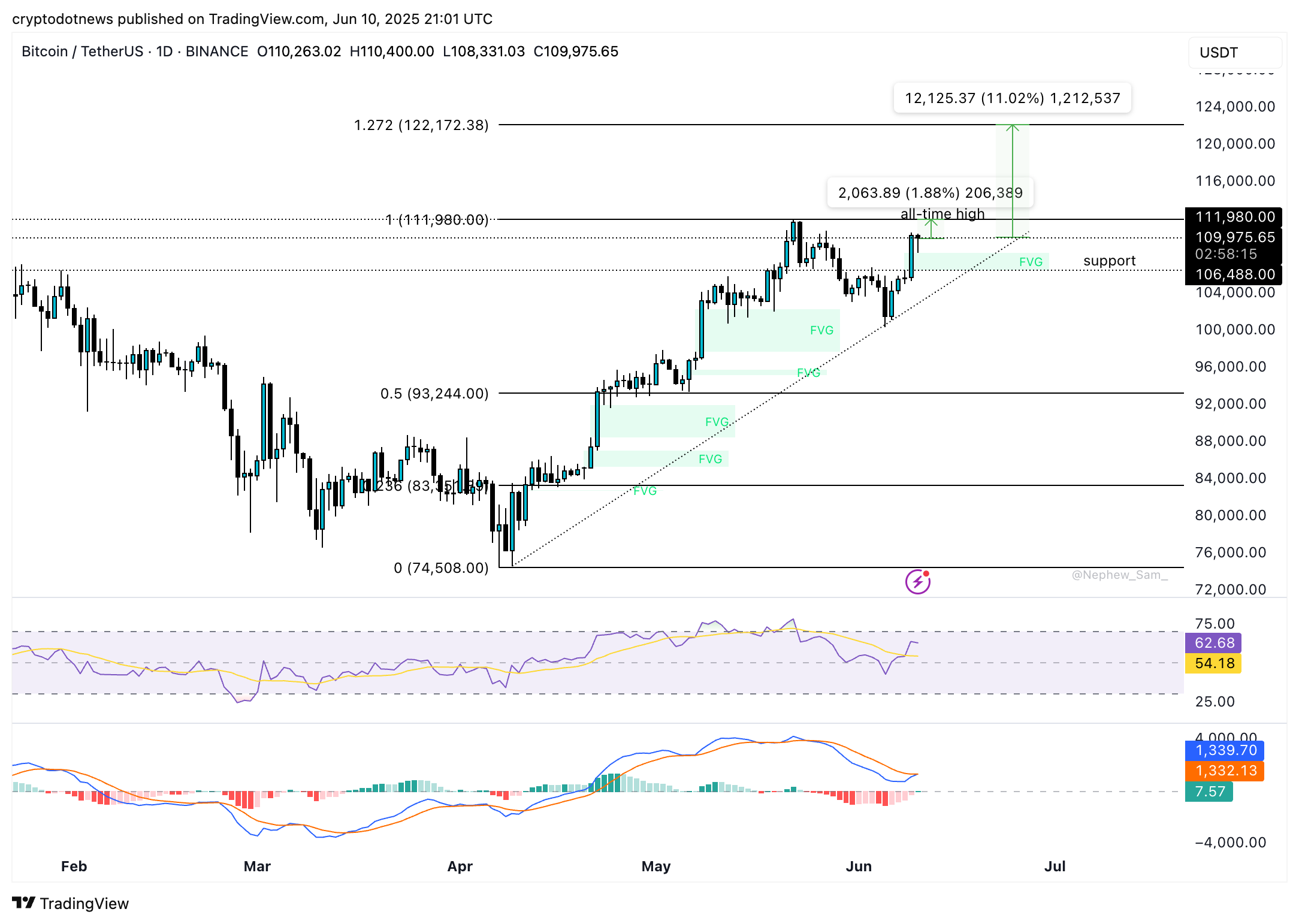 比特币价格距离111,980美元历史高点仅差不到2%。若重新测试前高并日线收于该价位上方,BTC或将开启价格探索之旅。BTC/USDT图表显示,从4月74,500美元低点至历史高点的127.2%斐波那契回撤位122,172美元可能成为下一目标。