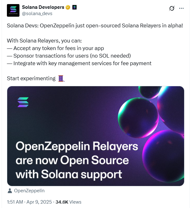 根据4月9日X平台上的帖子,Solana开发者正在庆祝Relayers开源带来的新时代。这一整合为平台用户提供了新功能,包括在应用程序中接受任何代币作为费用的能力。此外,用户还可以选择使用交易赞助功能,这不需要使用任何SOL代币。