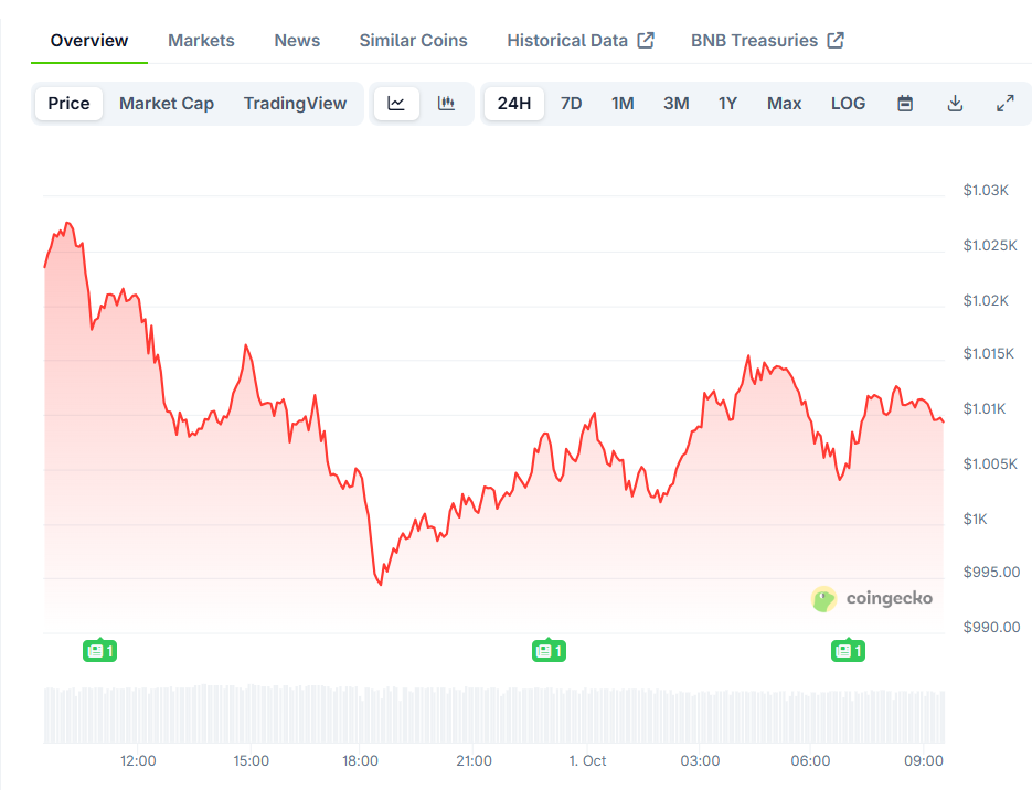 事件发生后BNB价格表现平稳:数据显示当日交易价格为1,009.85美元,24小时交易量超14.8亿美元,单日跌幅1.5%,周线仍保持0.24%的微幅上涨。
