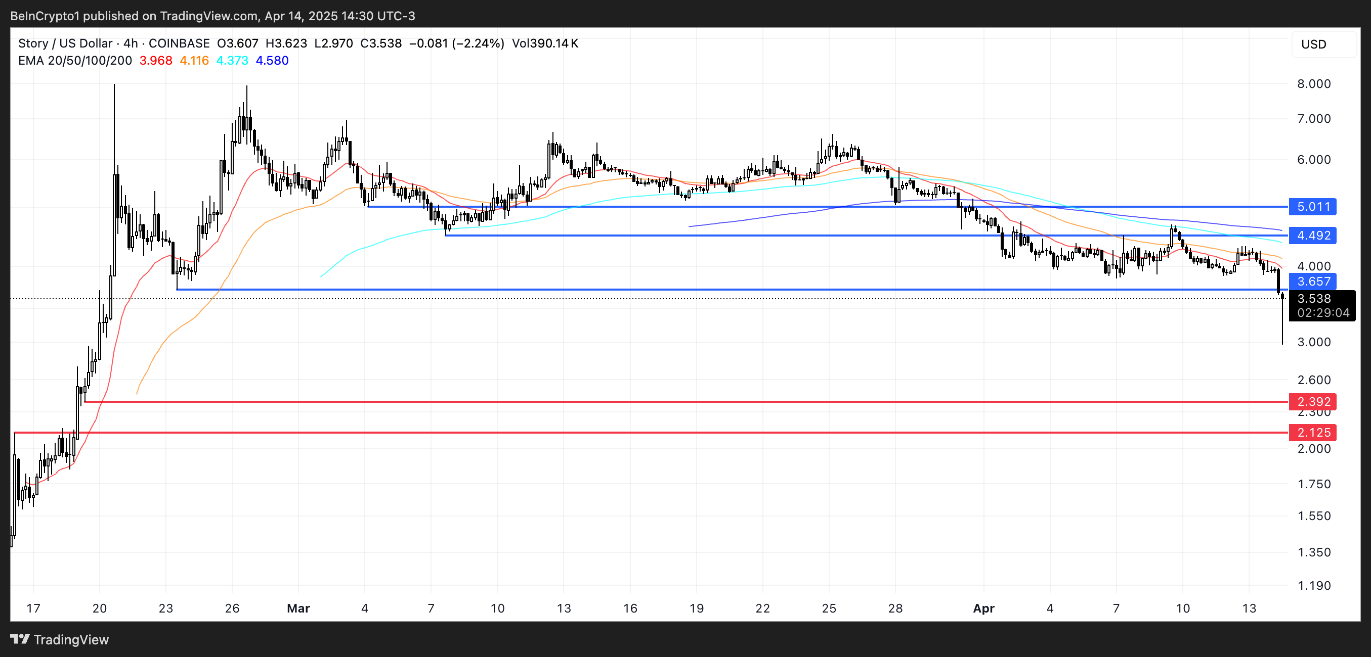 如果势头重新转向Story,该代币可能上涨并重新测试3.65美元的阻力位。之后,它有可能突破至4.49美元甚至5美元。然而,如果看跌压力持续,Story可能会跌破2.40美元,甚至可能下探至2.12美元。