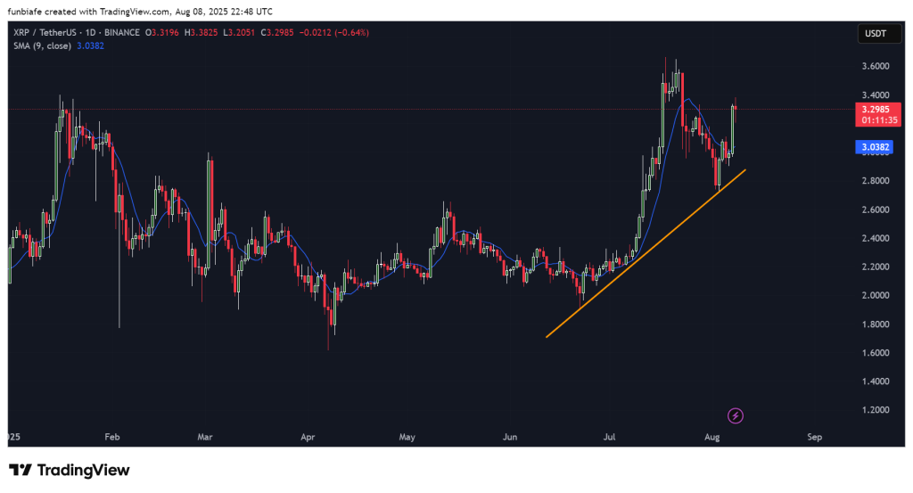 XRP价格在经历上周的回调后强势反弹,目前正坚守关键支撑位上方。自6月中旬以来的上升趋势保持完好,价格沿上升趋势线运行,但上方阻力位将决定多头是延续涨势还是动能停滞。